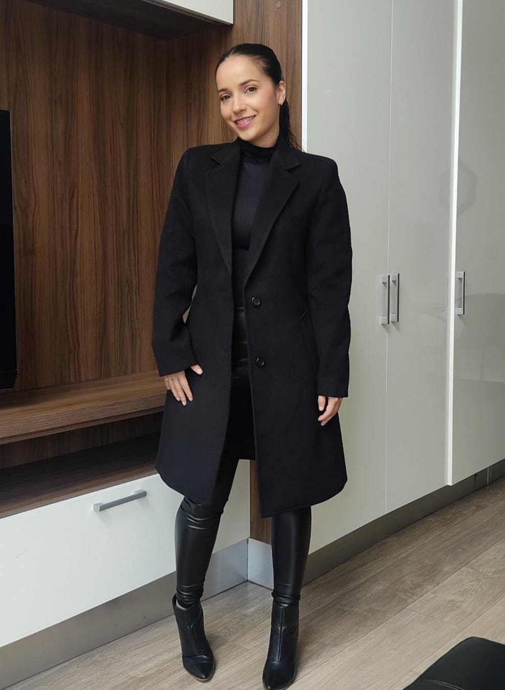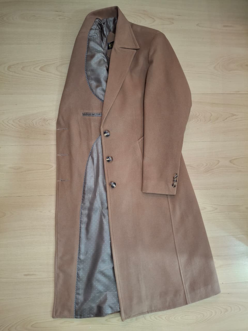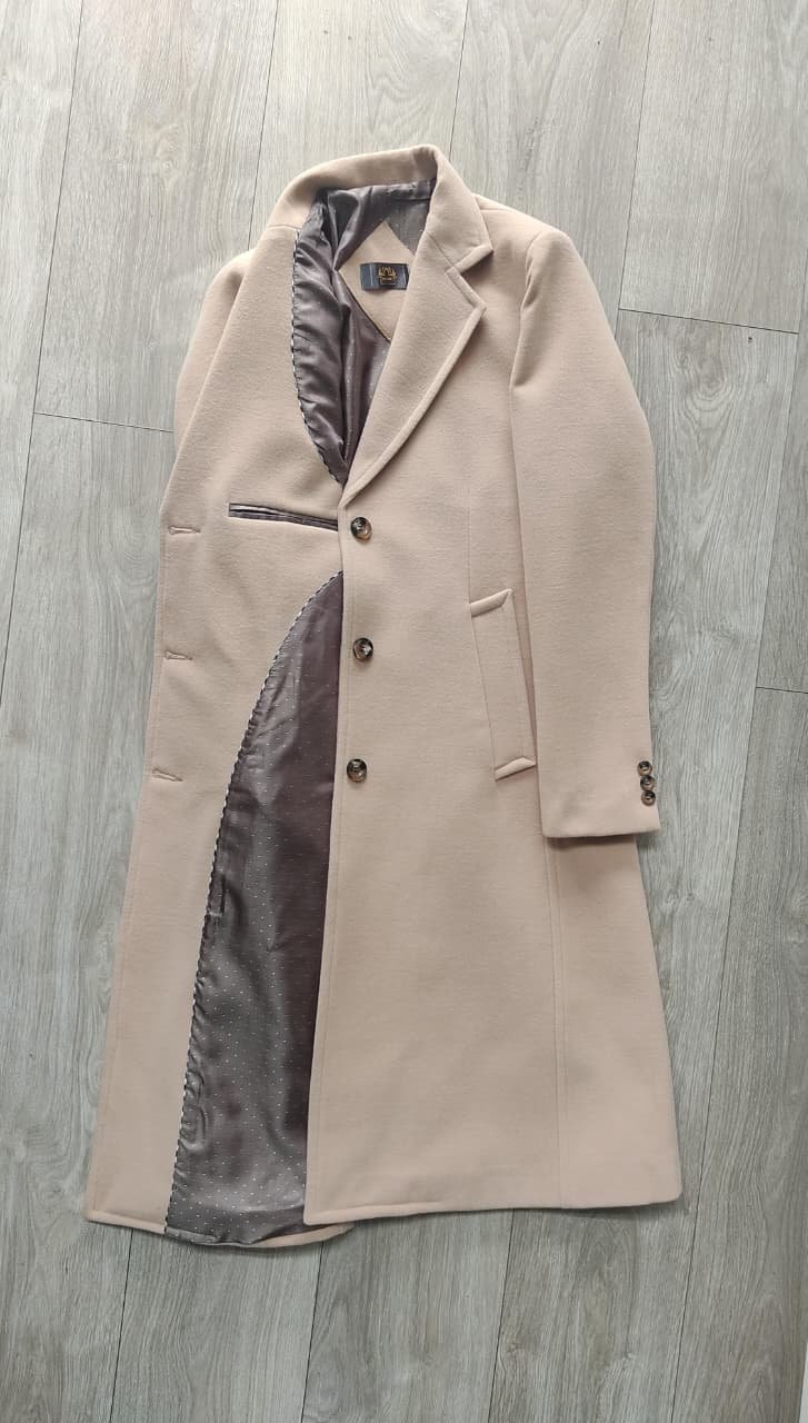 Gabán confeccionado en paño cashmere de 90 cm de largo. Posee solapa clásica cerrada, cierre frontal con tres botones y bolsillos diagonales externos. Incluye caja de puño con cuatro botones, dos bolsillos internos y abertura posterior.