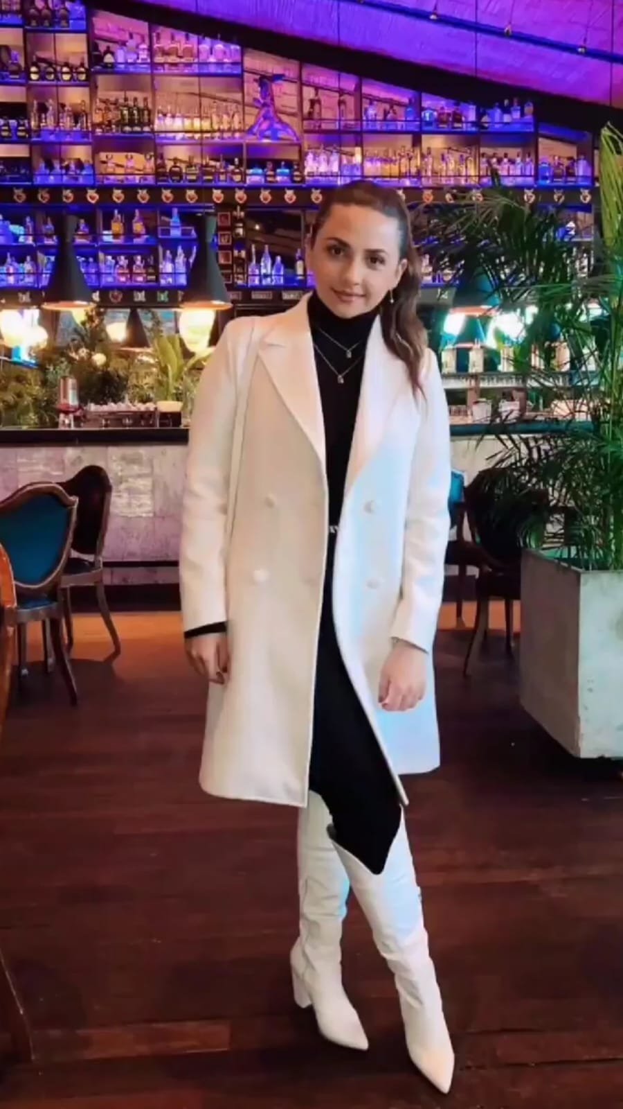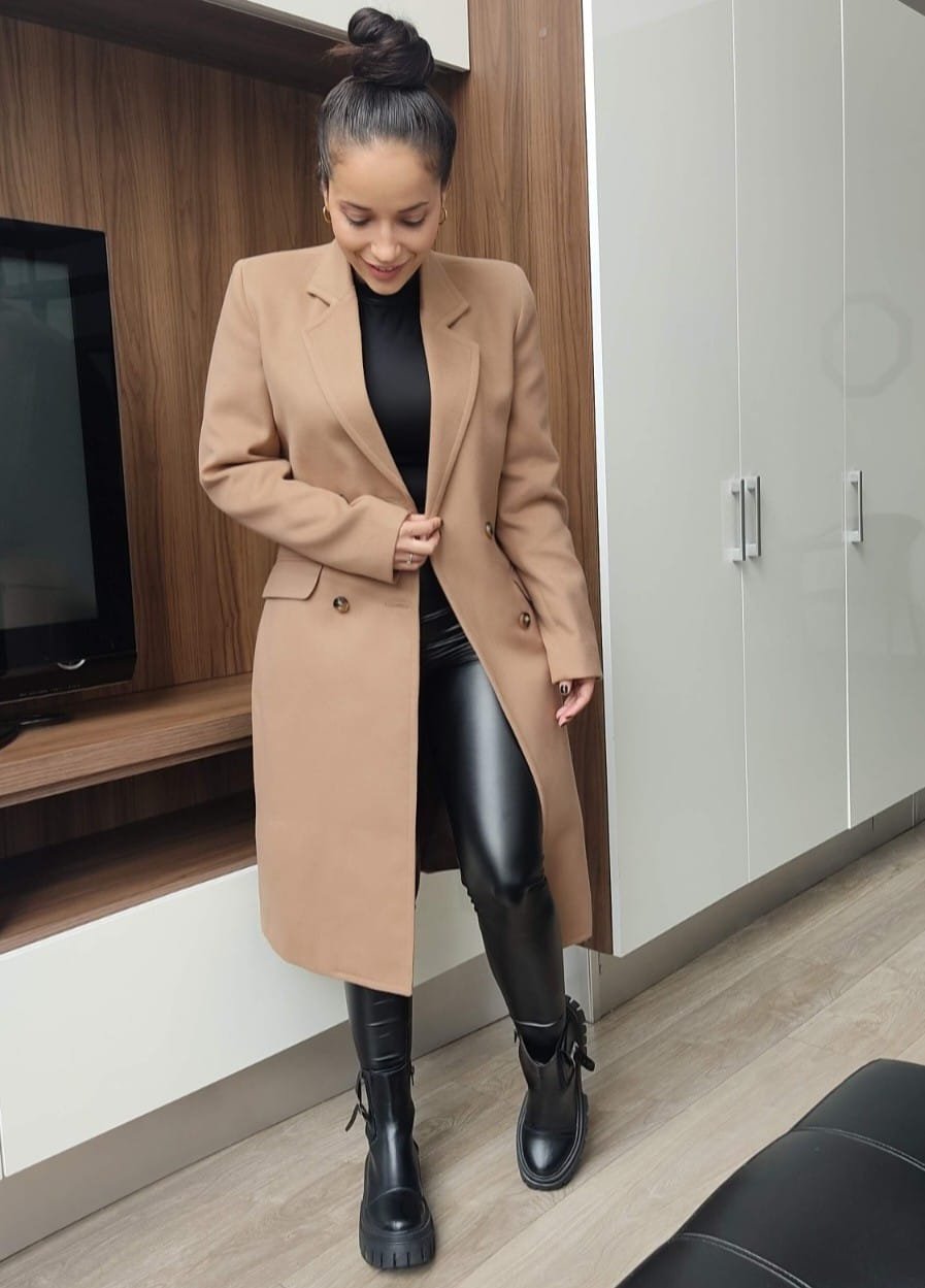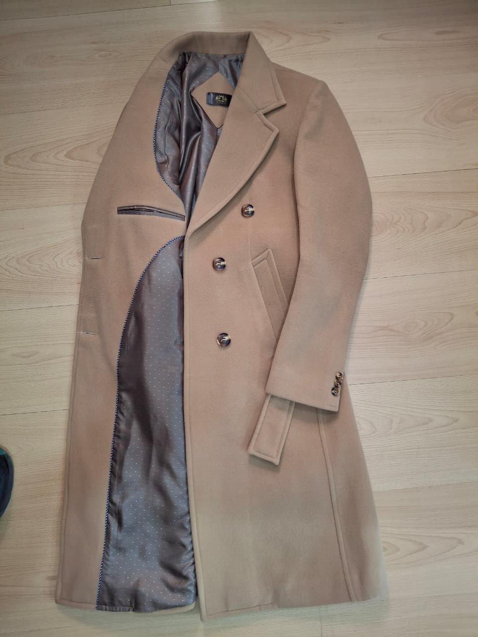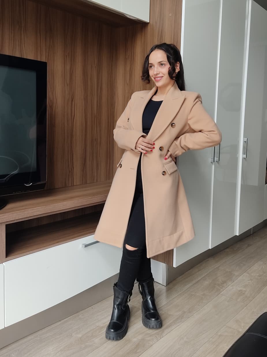 Abrigo cruzado en paño cashmere de 90 cm de largo. Diseñado con cuello subido de 9 cm y cierre de dos botones, presenta doble hilera frontal con cinco botones a cada lado y cinturón con pasadores para ajustar la silueta. Incluye bolsillos diagonales, dos bolsillos internos, charreteras en las mangas y abertura posterior.